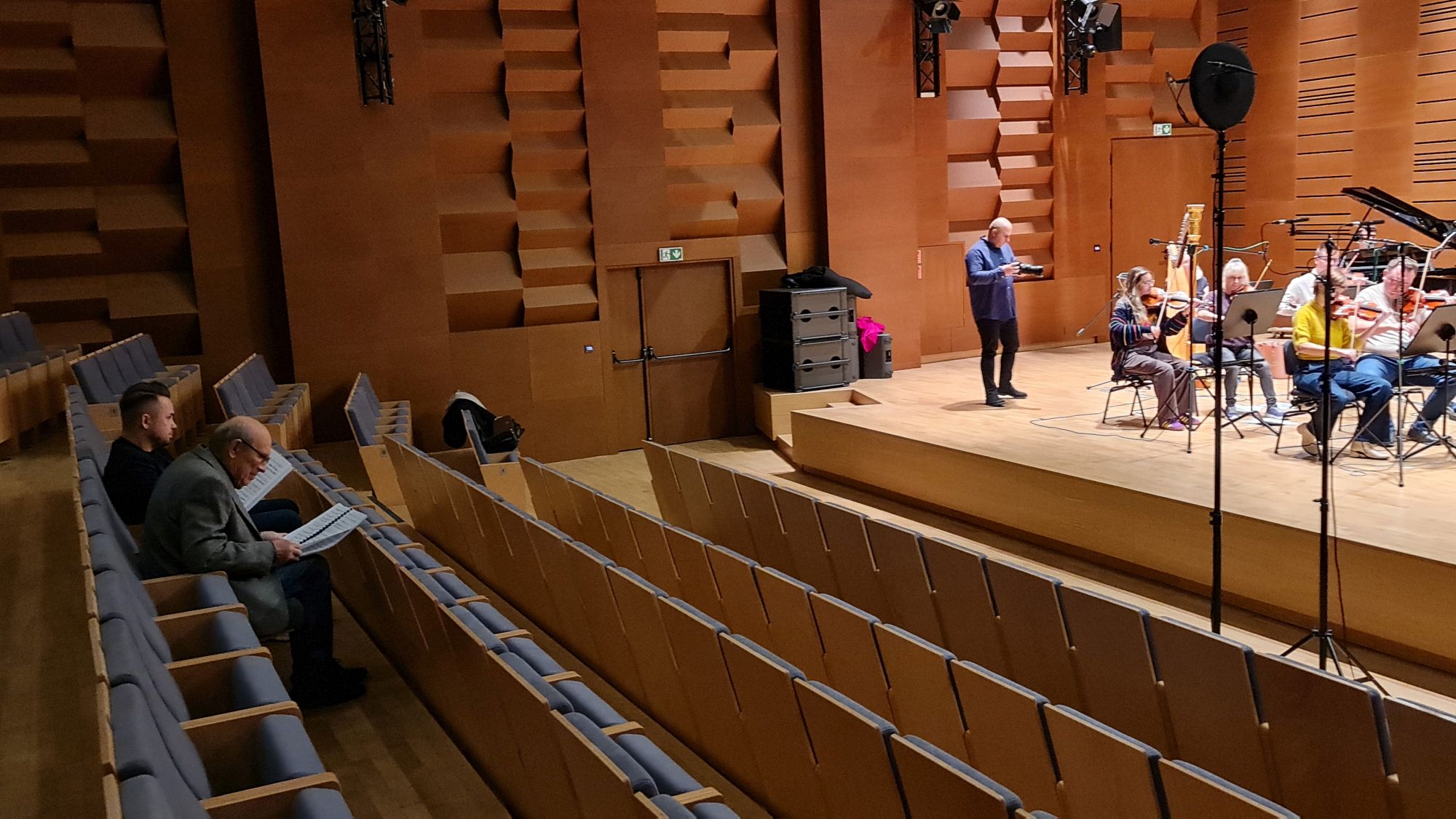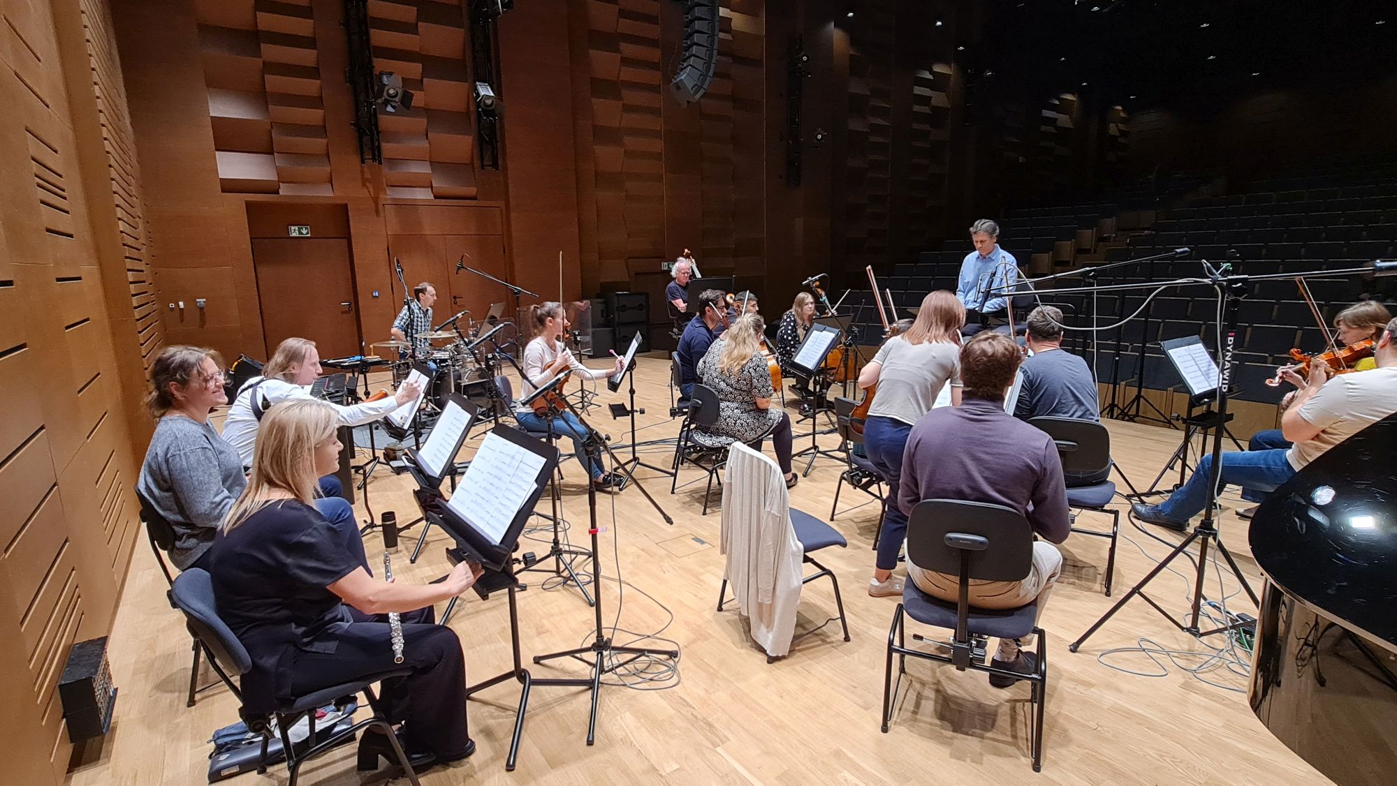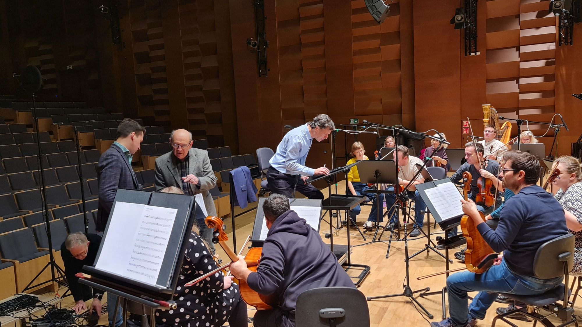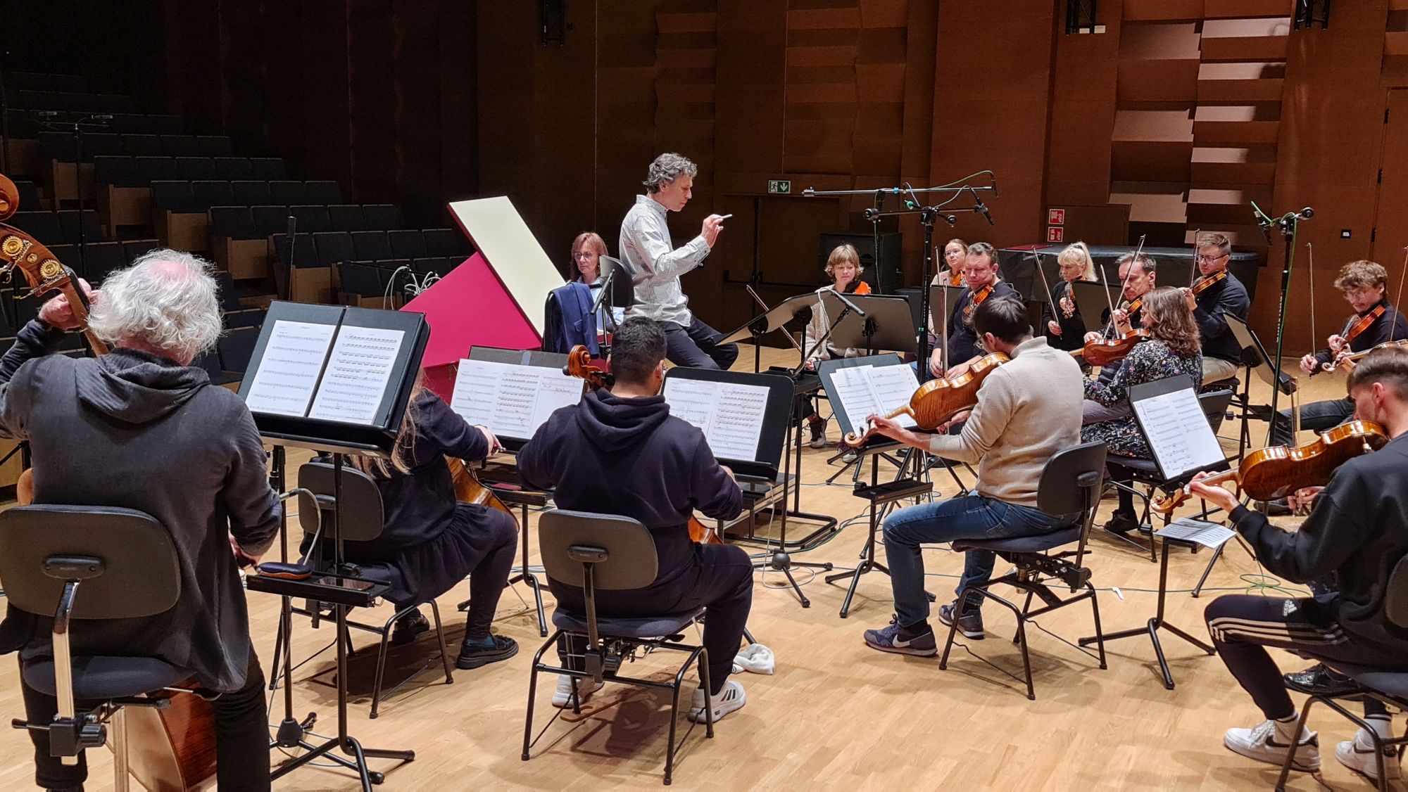 Zdjęcia z nagrań, które odbyły się 7 października 2025 i podczas których zarejestrowaliśmy cykl piosenek „Kocham cię kochać” do słów Grażyny Orlińskiej Mikołaja Hertla. Orkiestra Filharmonii Kameralnej im. Witolda Lutosławskiego w Łomży nagrywała pod batutą Jana Miłosza Zarzyckiego a reżyserem dźwięku był Andrzej Brzoska. Swoją obecnością zaszczycił nas sam kompozytor.