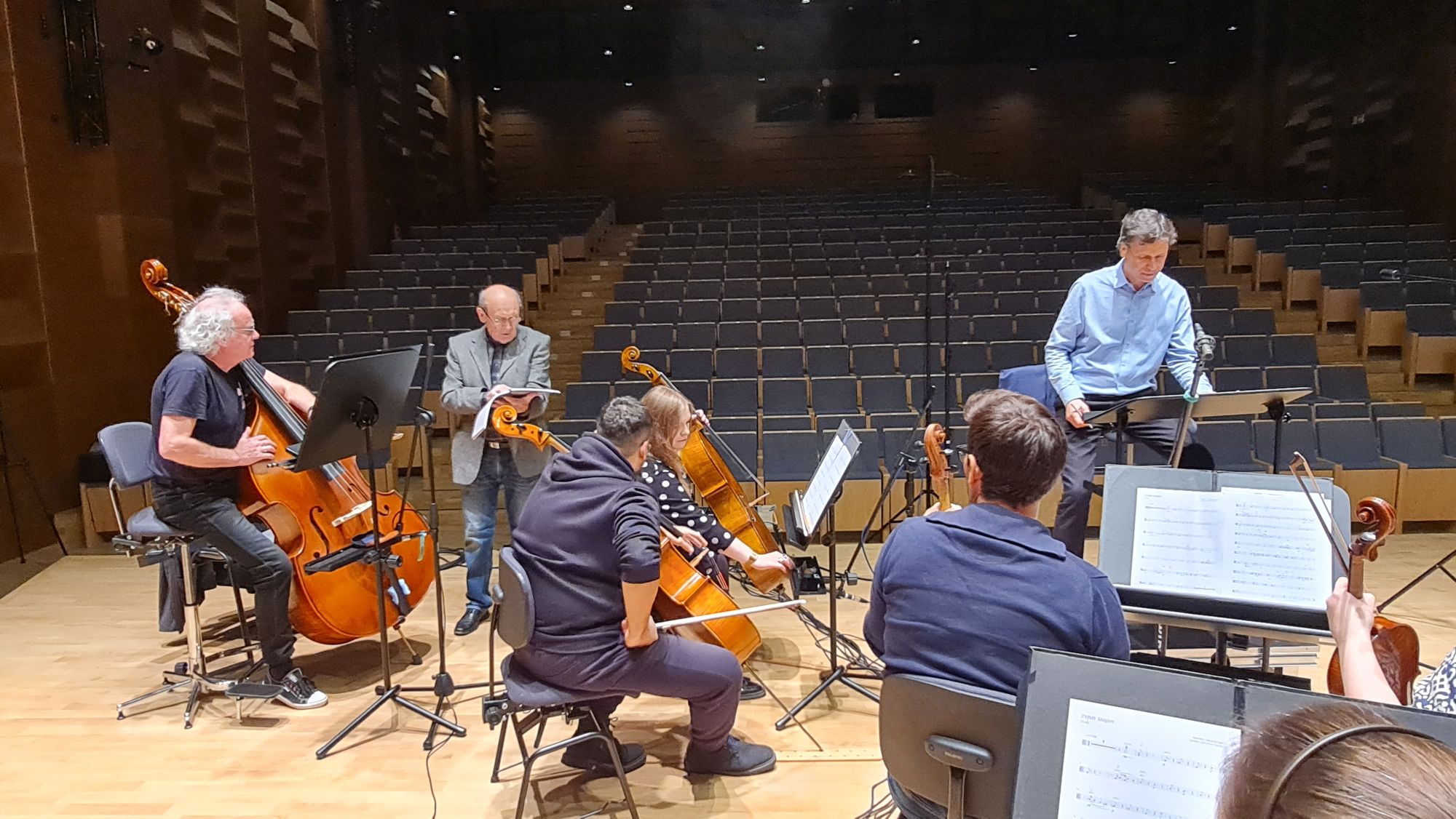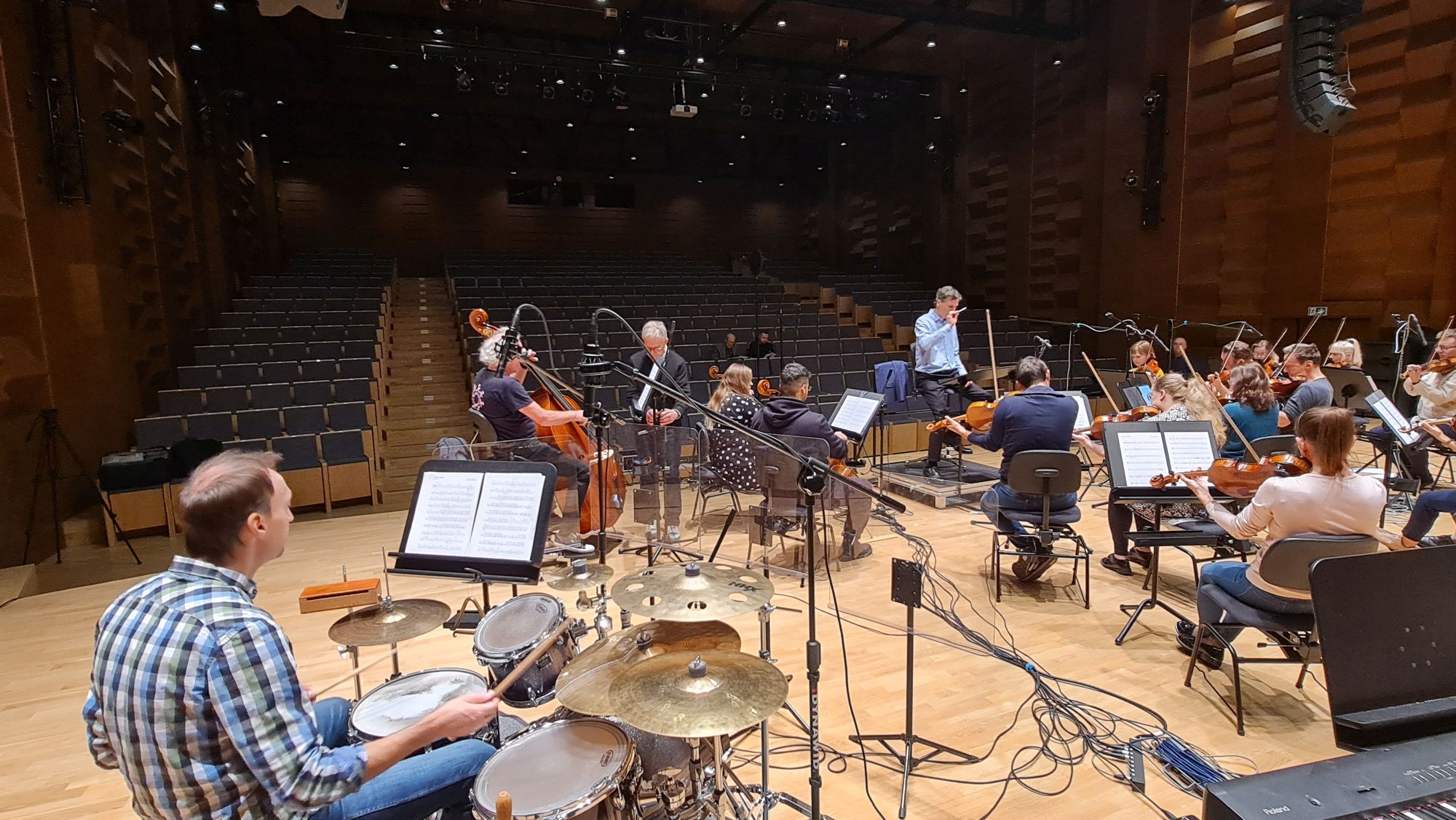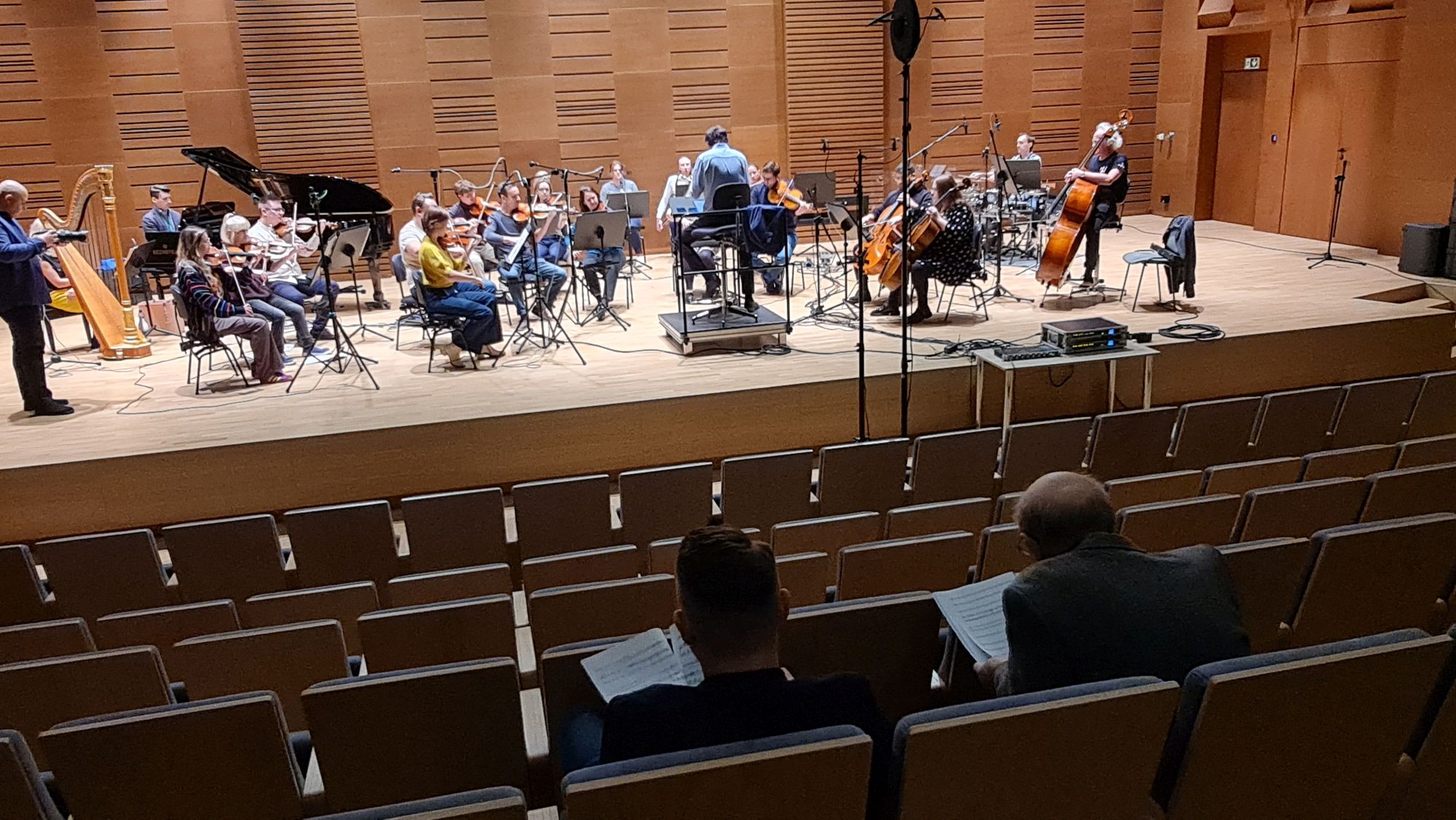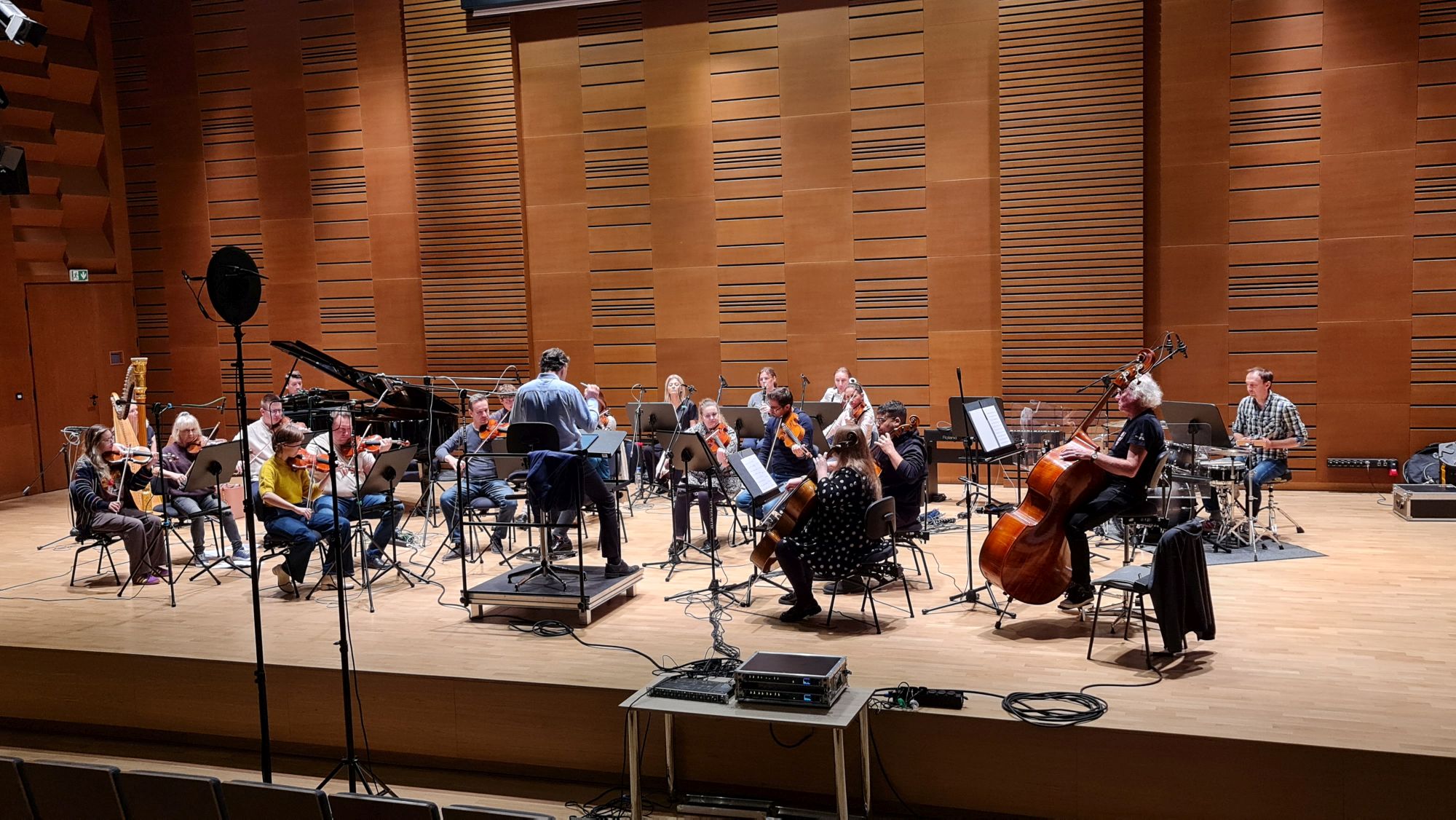 Zdjęcia z nagrań, które odbyły się 7 października 2025 i podczas których zarejestrowaliśmy cykl piosenek „Kocham cię kochać” do słów Grażyny Orlińskiej Mikołaja Hertla. Orkiestra Filharmonii Kameralnej im. Witolda Lutosławskiego w Łomży nagrywała pod batutą Jana Miłosza Zarzyckiego a reżyserem dźwięku był Andrzej Brzoska. Swoją obecnością zaszczycił nas sam kompozytor.