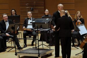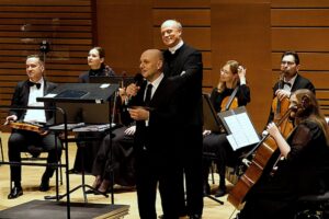Atrakcje były tradycyjnie jeszcze zanim rozbrzmiała muzyka, za sprawą losowania podwójnych zaproszeń na imprezy zewnętrzne, odbywające się w sali Filharmonii Kameralnej, dla posiadaczy koncertowych abonamentów, po czym znowu można było rozkoszować się pięknymi dźwiękami. Simple Symphony Brittena w wykonaniu łomżyńskiej orkiestry to coś niezwykle błyskotliwego i robiącego ogromne wrażenie na każdym, komu nieobce są muzyczny kunszt i wrażliwość na misterność wykonania, zwłaszcza w figlarnym Pizzicato i swawolnym Finale. Ciąg dalszy koncertu był równie interesujący, zabrzmiały bowiem dwa kolejne utwory na marimbę i orkiestrę smyczkową, oba w opracowaniu solisty. Do udziału w nich Iaroslav Sambulskyi zaprosił utalentowanego perkusistę Karola Kasperskiego, swego ucznia z Państwowej Szkoły Muzycznej I i II stopnia imienia Karola Szymanowskiego w Zamościu oraz członka zespołu, z którym zdobył Grand Prix podczas International Festival Talents World Stars 2021 w Stanach Zjednoczonych. Uczeń zasiadł za tradycyjnym zestawem perkusyjnym, mistrz stanął za marimbą, po czym zabrzmiało „Namysto” (Yuryi Polowyi), urokliwa ukraińska melodia z ludowymi akcentami. Finał koncertu by jeszcze bardziej efektowny, za sprawą słynnego evergreenu „Tequila” (Chuck Rio). Poprzedził go długi perkusyjny wstęp, solista w trakcie grał nie tylko na marimbie, ale również na bębenkach, a orkiestra zapewniła, jedyny w swoim rodzaju, latynoski klimat. Publiczność również nie pozostawała bezczynna, dzięki uwypuklającym rytm oklaskom oraz okrzykom „Łomża!”, które bardzo dobrze zastąpiły w kluczowych momentach utworu tytułową „Tequilę”. I chociaż króciutki bis pozostawił w słuchaczach uczucie niedosytu, to jednak w grudniu odbędą się jeszcze dwa koncerty w ramach cyklu „Forum Młodych Chopinistów”, organizowanego przez Filharmonię Kameralną im. Witolda Lutosławskiego we współpracy z Narodowym Instytutem Fryderyka Chopina oraz Ministerstwem Kultury i Dziedzictwa Narodowego, a sami filharmonicy wystąpią aż czterokrotnie. Warto jednak pomyśleć o zaopatrzeniu się w bilety na te koncerty już teraz, ponieważ koncert kolędowy oraz oba sylwestrowe cieszą się bardzo dużym zainteresowaniem.
