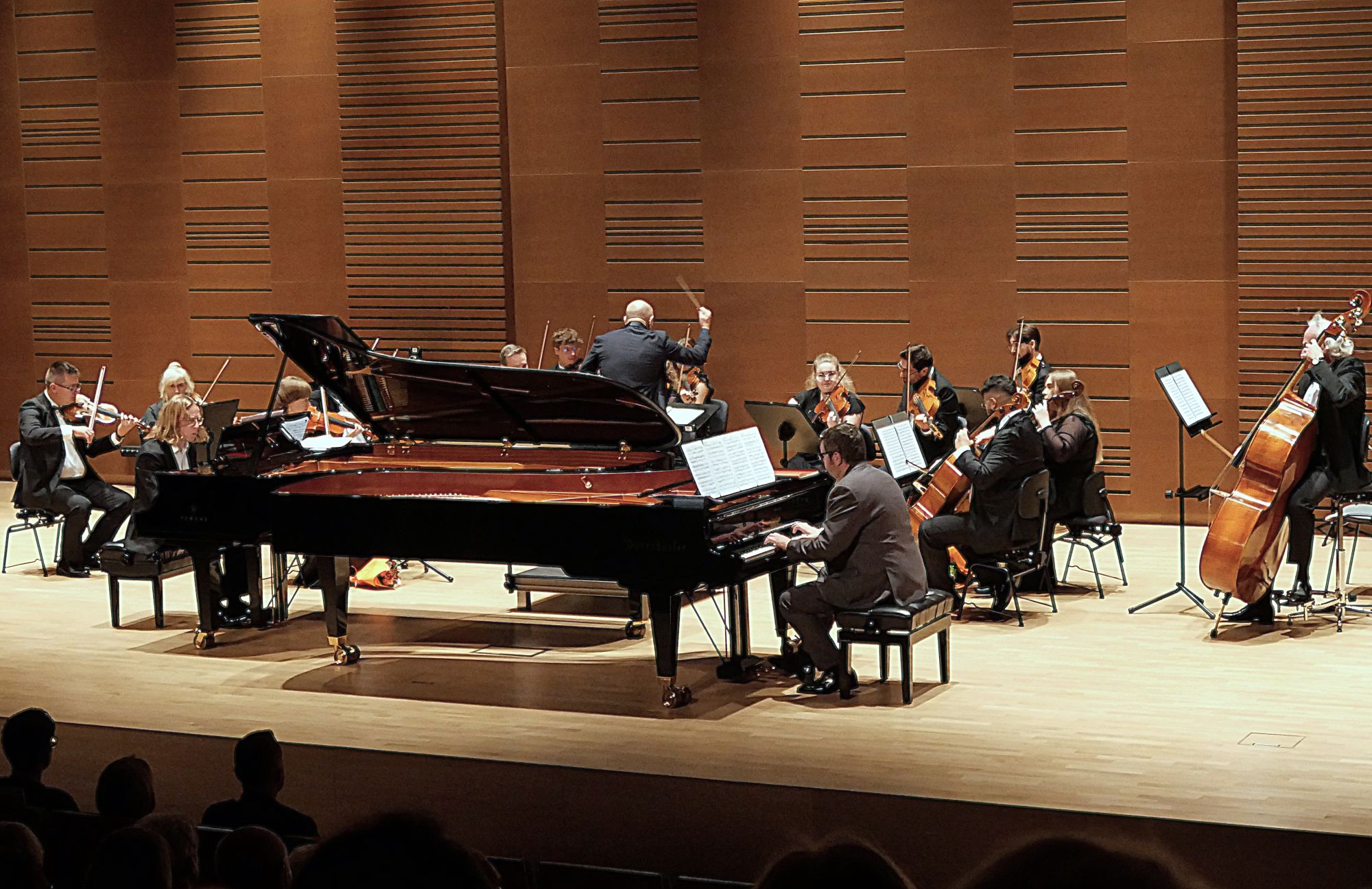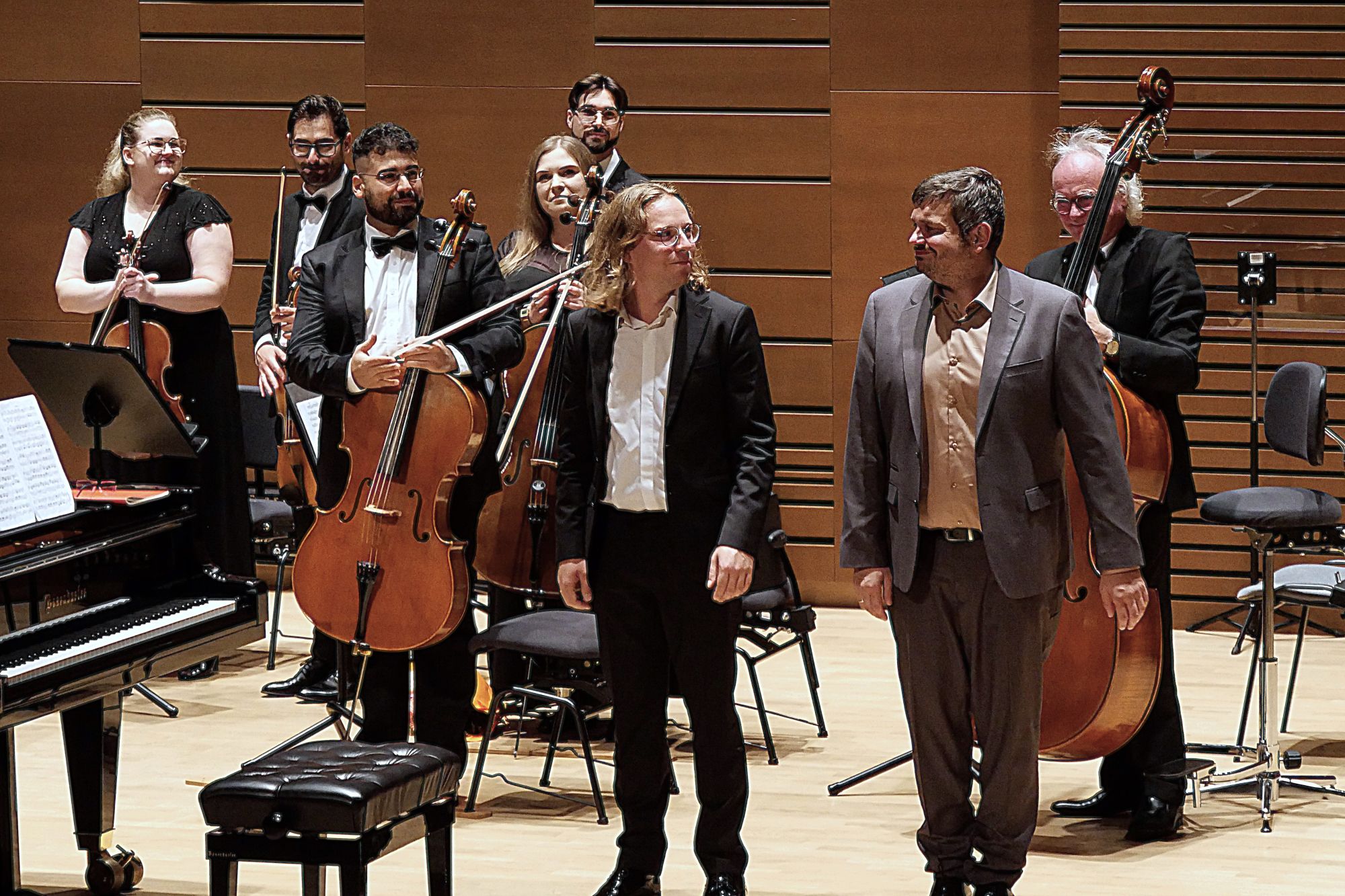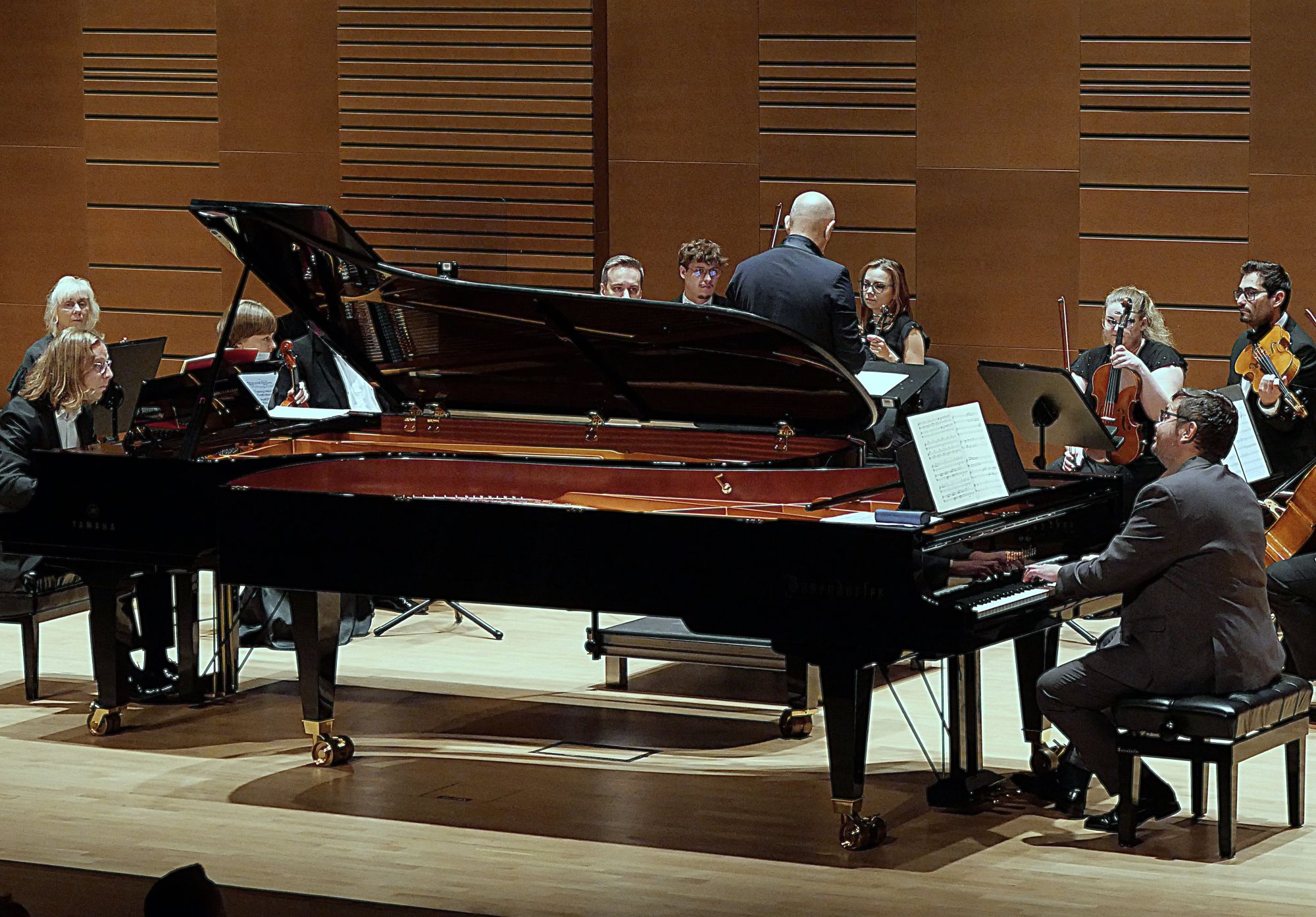 Po tym interesującym wprowadzeniu zabrzmiały dwa główne punkty programu. Dzięki partnerom koncertu, firmom Yamaha i Bösendorfer, za ich fortepianami zasiedli dwaj utytułowani pianiści Michał Rot i Marcin Kawczyński, od niedawna współpracujący w duecie i występujący wspólnie coraz częściej. Już w Koncercie na 2 fortepiany nr 7 F-dur KV 242 Mozarta zaprezentowali artystyczną dojrzałość, interpretacyjną wrażliwość, mistrzowskie opanowanie instrumentów, a do tego również perfekcyjne zgranie, co przełożyło się na nader stylowe, skrzące się różnymi barwami, wykonanie. W Koncercie na 2 fortepiany c-moll BWV 1060 Jana Sebastiana Bacha finezja techniczna obu pianistów oraz równie duża swoboda wykonawcza były równie imponujące, ale godne podkreślenie jest to, że mieli oni w orkiestrze równorzędnych partnerów, co podkreślali po koncercie, komplementując łomżyńskich muzyków, a współpracujący z Filharmonią Kameralną od lat maestro de Lorenzo poprowadził całość z ogromnym wyczuciem, wykorzystując wszystkie atuty niewielkiej, zaledwie 15-osobowej, ale świetnie brzmiącej orkiestry smyczkowej.